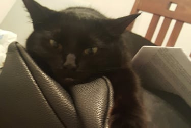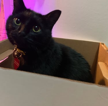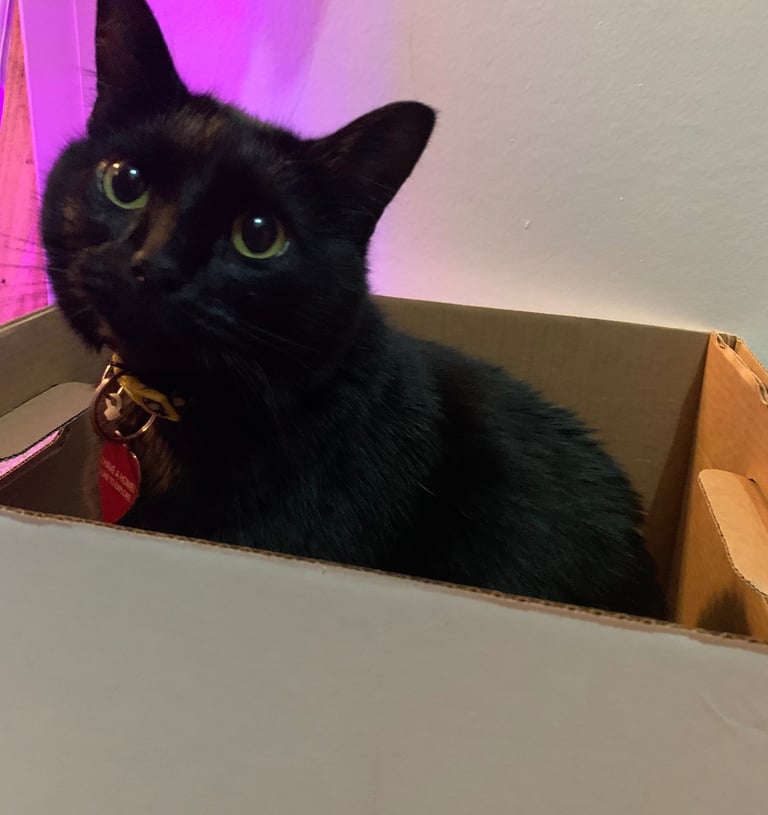 On the days I work from my home office, you may catch glimpses of my cat*, who likes to sit on my lap sometimes. Her name is Louise! She’s a black cat and is about 12 years old.